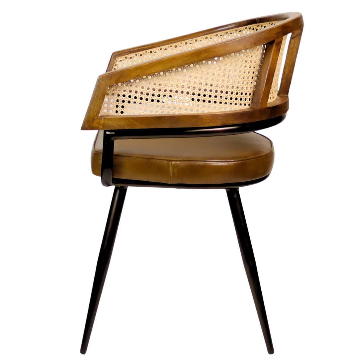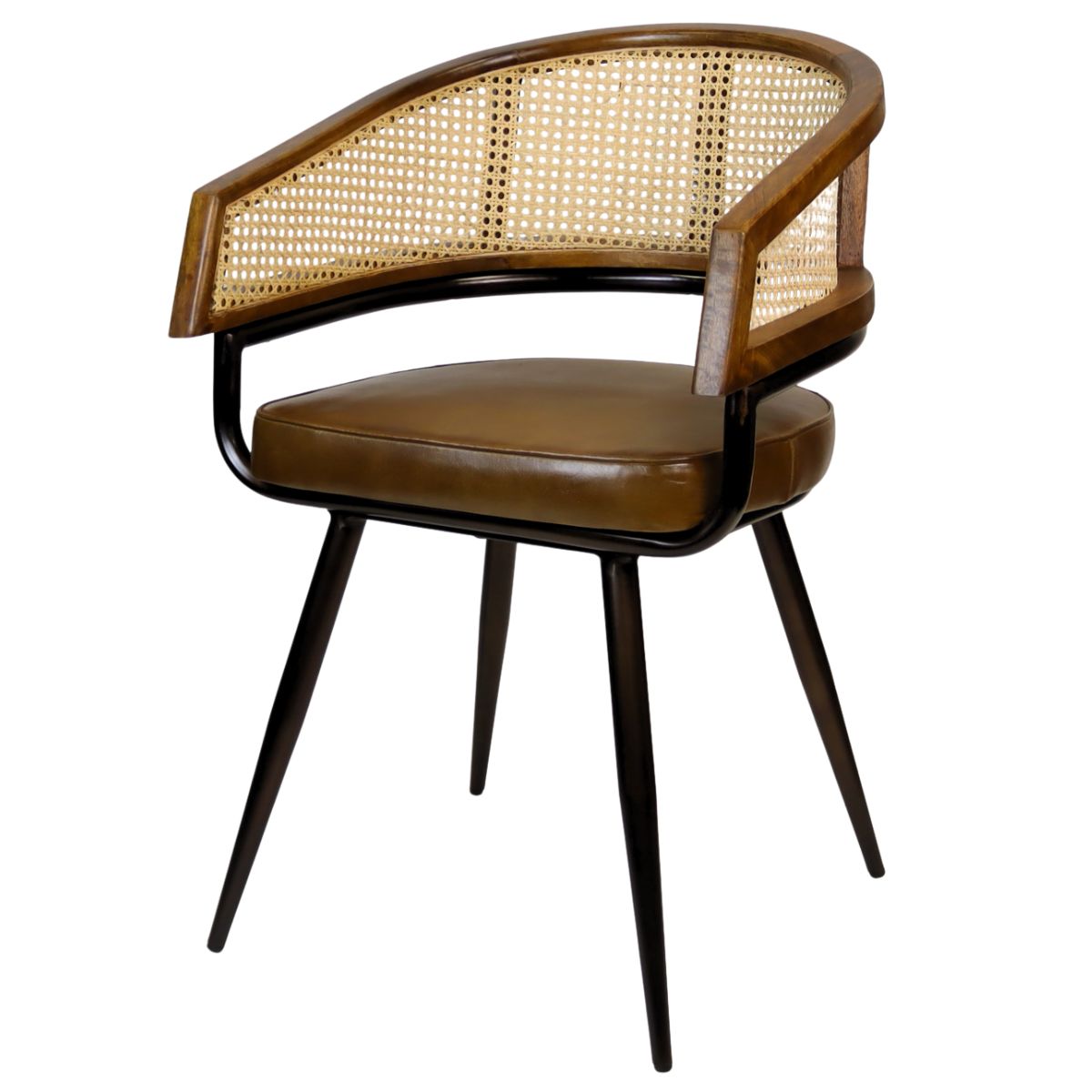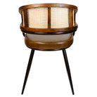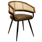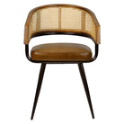 The Sona Carver Chair is an industrial metal frame arm chair with cane/rattan back and wooden detailing. The seat pad is upholstered in a dark brown real leather.